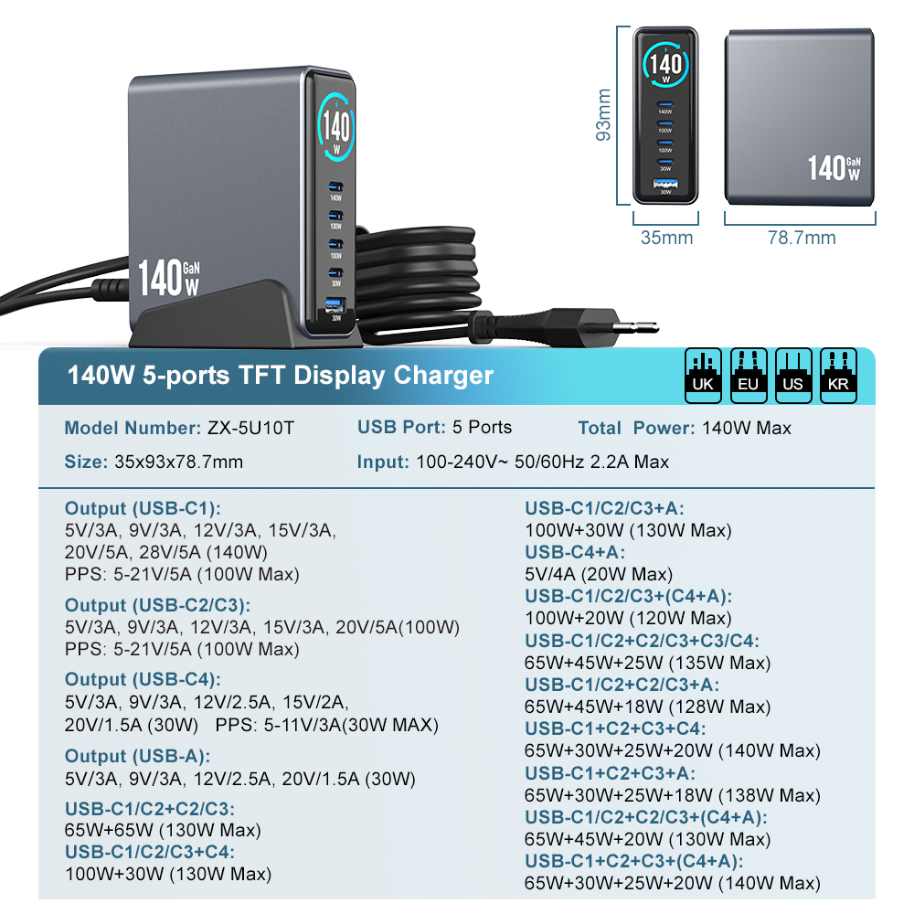 Die ZX-5U10T Desktop-GaN-Ladegerät mit 140 W Display ist eine leistungsstarke Desktop-Ladelösung mit mehreren Anschlüssen für Laptops, Tablets, Smartphones und mehrere USB-C-Geräte.