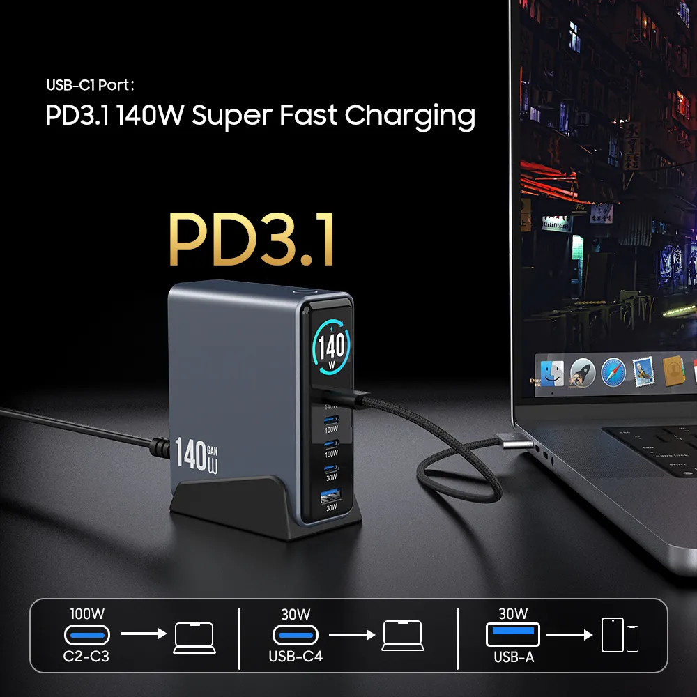 Gebaut mit fortschrittliche GaN-Technologie (Galliumnitrid). und USB-C PD 3.1, es liefert bis zu 140 W Single-Port-Ausgang bei gleichzeitig stabiler Leistung, geringerer Hitzeentwicklung und kompakter Größe.