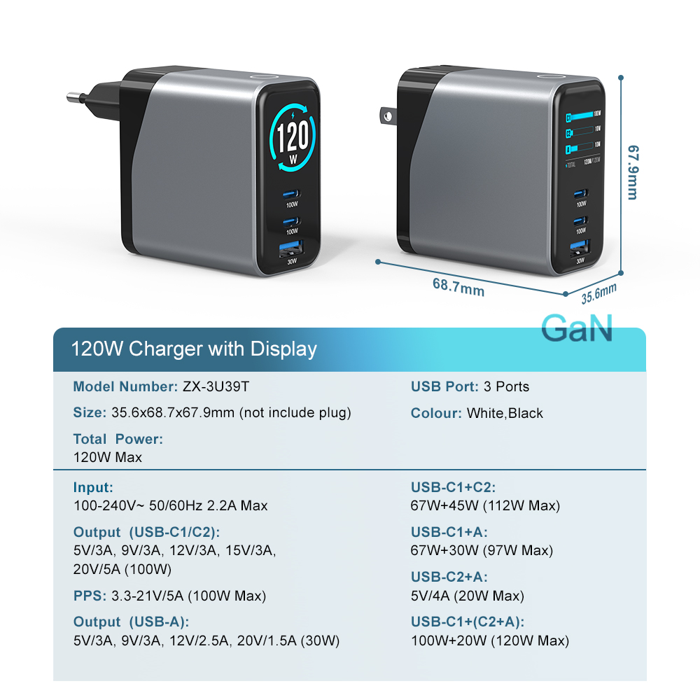 ·GaN Chip Technology: The gan charger equips with the GaN technology, not only reduces the size and weight of the usb c charger block but also generates less heat, reduces power consumption effectively. And the 120W charger improves charging efficiency considerably, making charging more convenient.